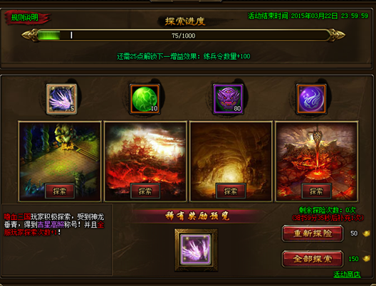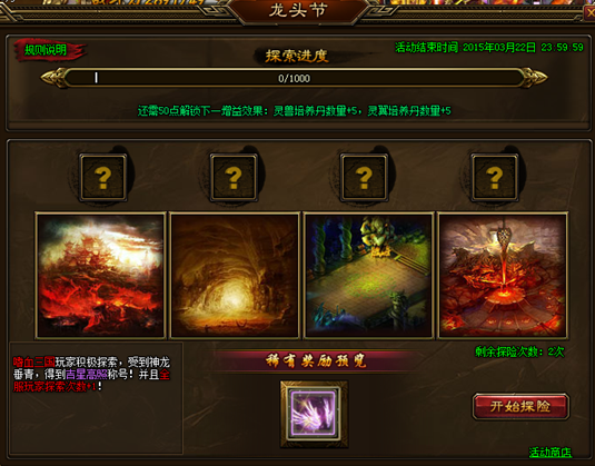 5. 每次探索时,均有可能触发神秘事件,触发者会获得永久称号奖励,并且全服玩家增加1次探险次数。